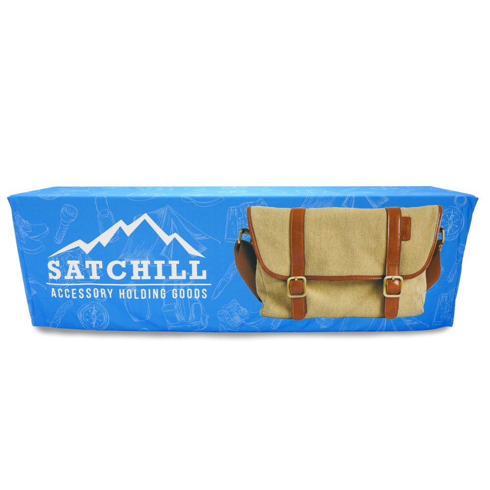 New 8 ft. sized Fitted Table Throw! Get your graphic edge-to-edge custom printed on fitted table throw that is made to fit 8 ft. tables. This option is 4-sided, fully covering the front, back and sides of the table. Our Fitted Table Throws fit snug around the table.