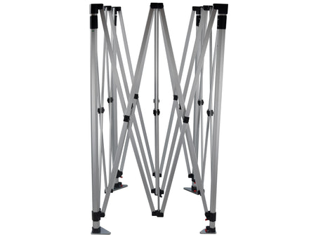Heavy duty hex shape 40 mm. aluminum hardware gives the tent strength in outdoor installations. Telescopic legs allow you to adjust the height, and the interior lattice expands the tent interior with the crank of a handle. Each leg has a foot plate ready to be staked to the ground. (Ropes, stakes, and standard carrying bag included with hardware).