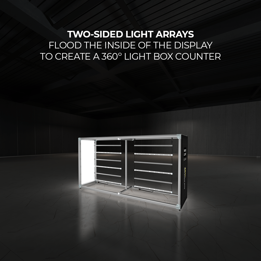 Breathe new light into your brand, exhibit, event or retail shop with the WaveLight® Casonara SEG Light Counters. This pioneering new SEG tension fabric light box is designed to make backlit graphics more portable, modular and customizable. Our 360º illumination technology provides more visibility for your brand and more places to present your ideas. We have also color coded the frames which provides our users the ability to quickly assemble and disassemble the display without tools ––or breaking a sweat.